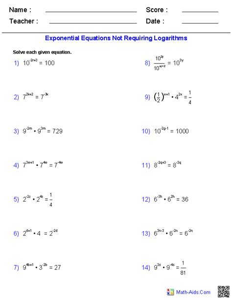 Algebra 2 Worksheets Exponential and Logarithmic Functions Worksheets from www.math-aids.com
